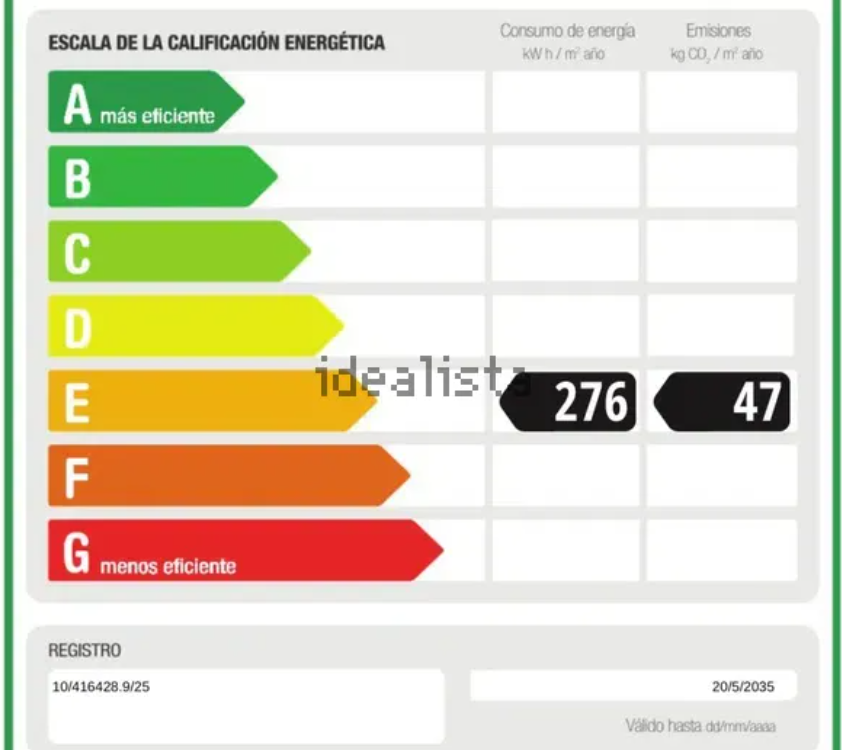 • Certificado energéticoConsumo: 276 kWh/m² año. Emisiones: 47 kg CO2/m² año